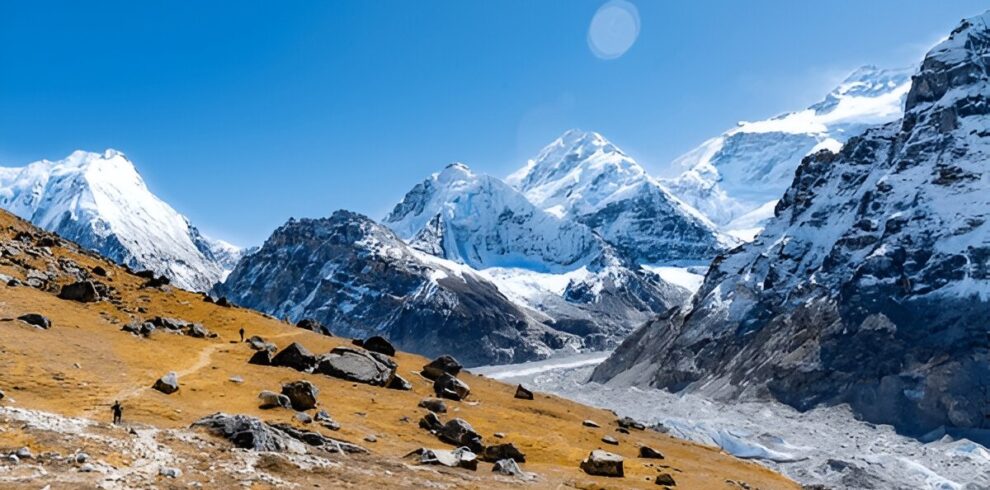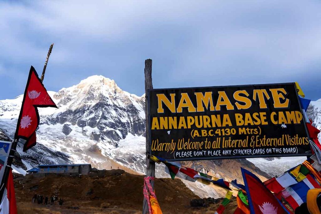 The Annapurna Base Camp Trek leads into the heart of the Annapurna Sanctuary, finishing at Annapurna Base Camp (4,130 m) with 360° views of Annapurna I, Annapurna South, Hiunchuli, and Machhapuchhre. Most routes pass Machhapuchhre Base Camp (≈3,700 m) before the final push to ABC. Expect warm teahouses, forested trails, suspension bridges, and terraced fields on the approach; higher up, the scenery opens to glacial valleys and big mountain amphitheatres.